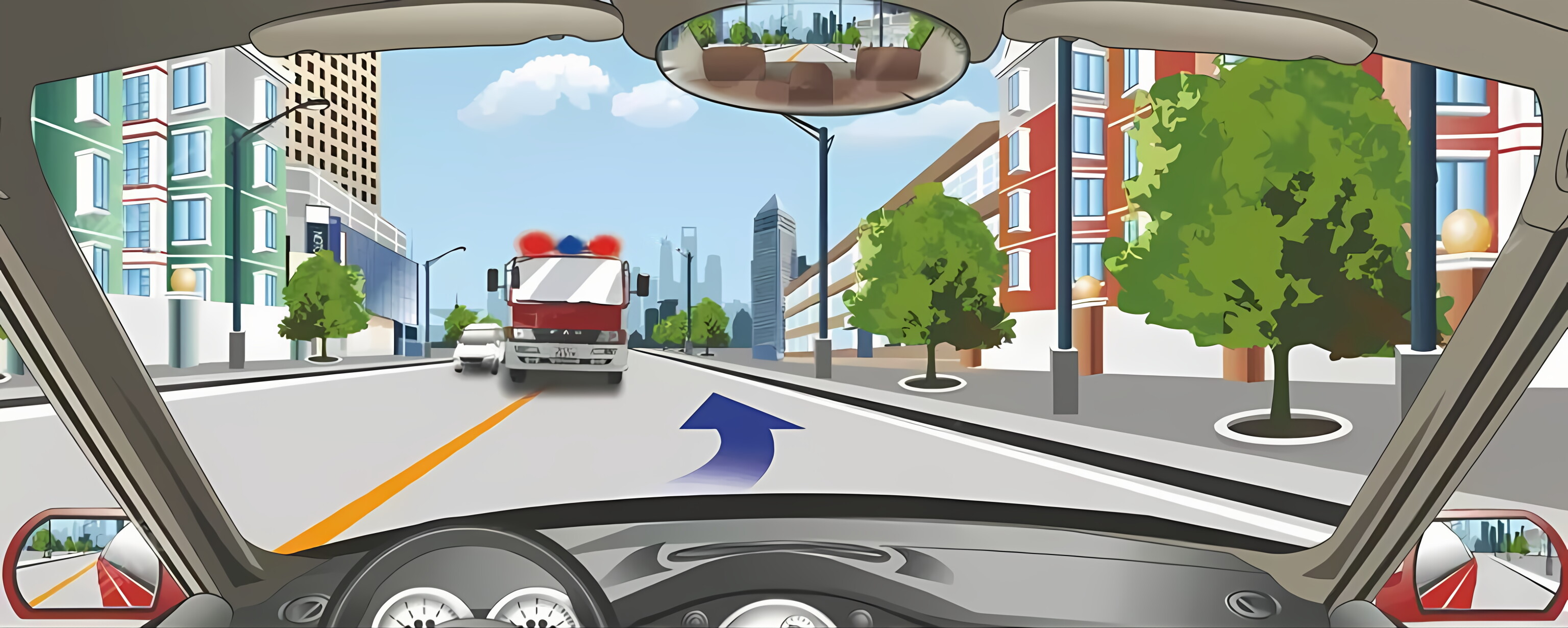 图中对向车辆是正在执行公务的消防车,我方车辆要靠右侧减速让行而且此时通过观察后视镜,可以看出汽车后方没有车辆,可以”迅速靠右侧减速让行”。