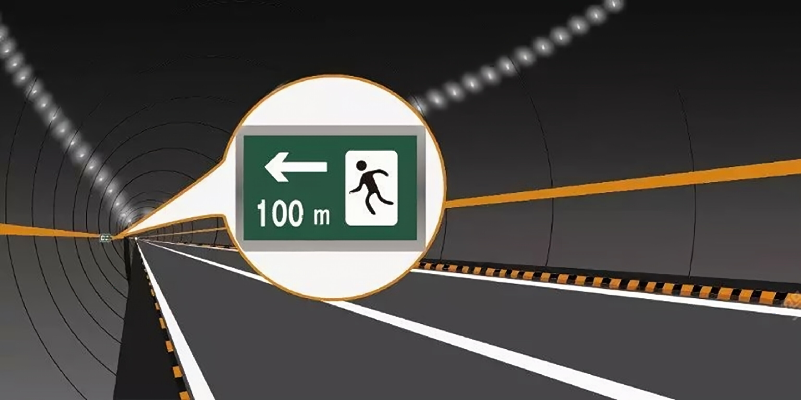 如图所示,遇隧道内发生火灾等紧急情况需疏散逃生时,驾乘人员应按照下图标识指示的方向逃生。